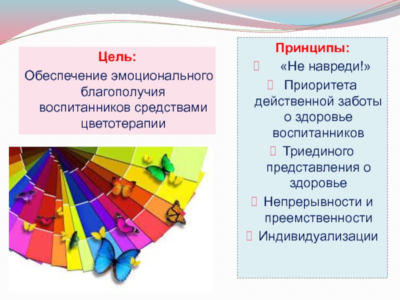 Цель:Обеспечение эмоционального благополучия воспитанников средствами цветотерапииПринципы: «Не навреди!» Приоритета действенной заботы о здоровье воспитанниковТриединого представления о здоровьеНепрерывности