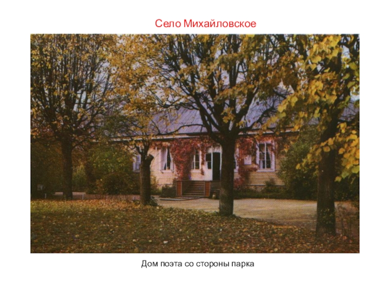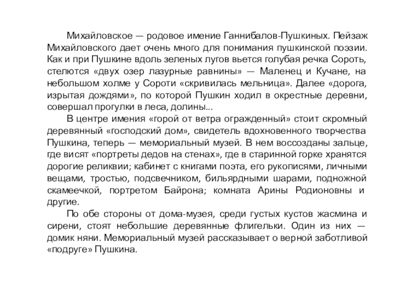 Слайд 3Михайловское — родовое имение Ганнибалов-Пушкиных. Пейзаж Михайловского дает очень много для