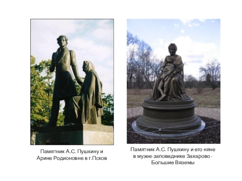 Слайд 19Памятник А.С. Пушкину и его няне в музее-заповеднике Захарово - Большие
