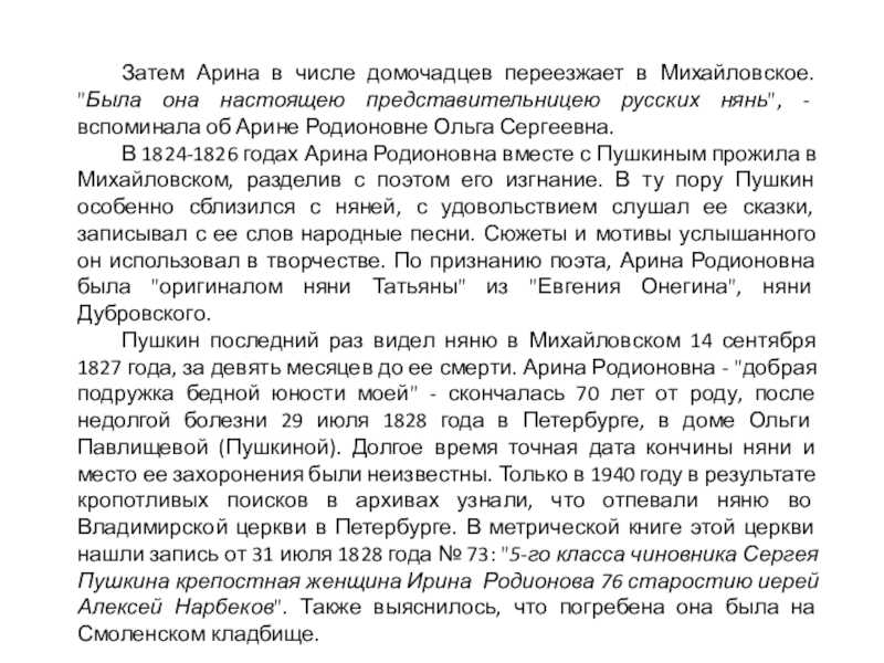 Слайд 12Затем Арина в числе домочадцев переезжает в Михайловское.