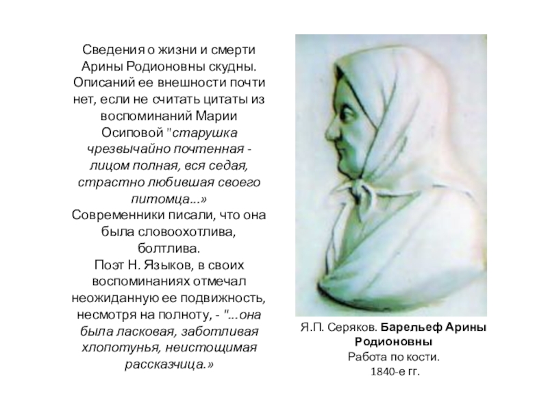 Слайд 13Я.П. Серяков. Барельеф Арины Родионовны