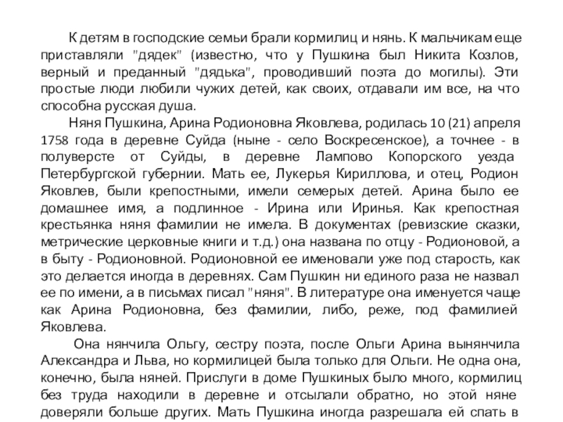 Она нянчила Ольгу, сестру поэта, после Ольги Арина вынянчила Александра и Льва, но кормилицей была только для Ольги. Не одна она, конечно, была няней. Прислуги в доме Пушкиных было много, кормилиц без труда находили в деревне и отсылали обратно, но этой няне доверяли больше других. Мать Пушкина иногда разрешала ей спать в господском доме.