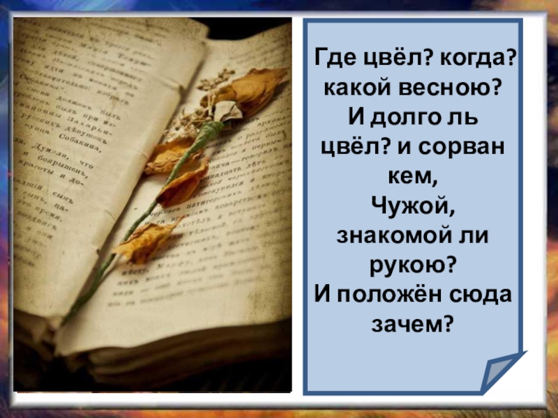 Где цвёл? когда? какой весною?И долго ль цвёл? и сорван кем,Чужой, знакомой ли рукою?И положён сюда зачем?