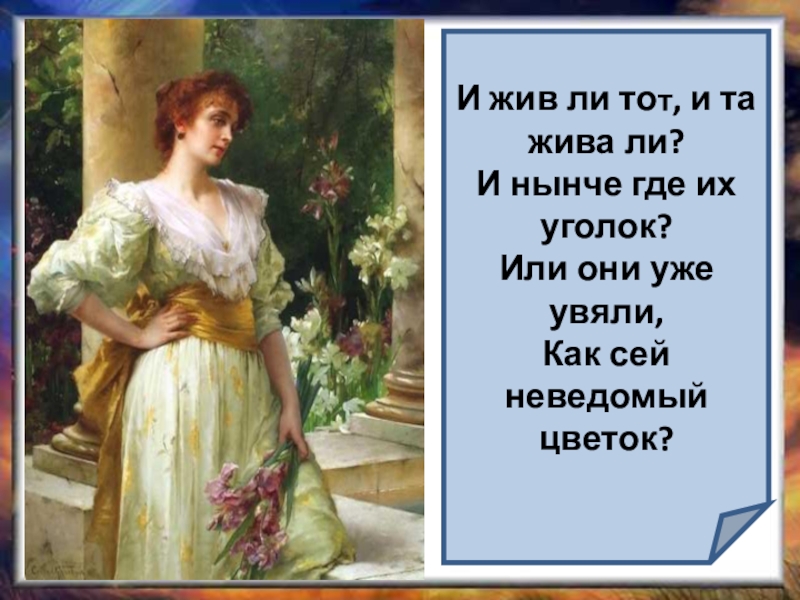 И жив ли тот, и та жива ли?И нынче где их уголок?Или они уже увяли,Как сей неведомый