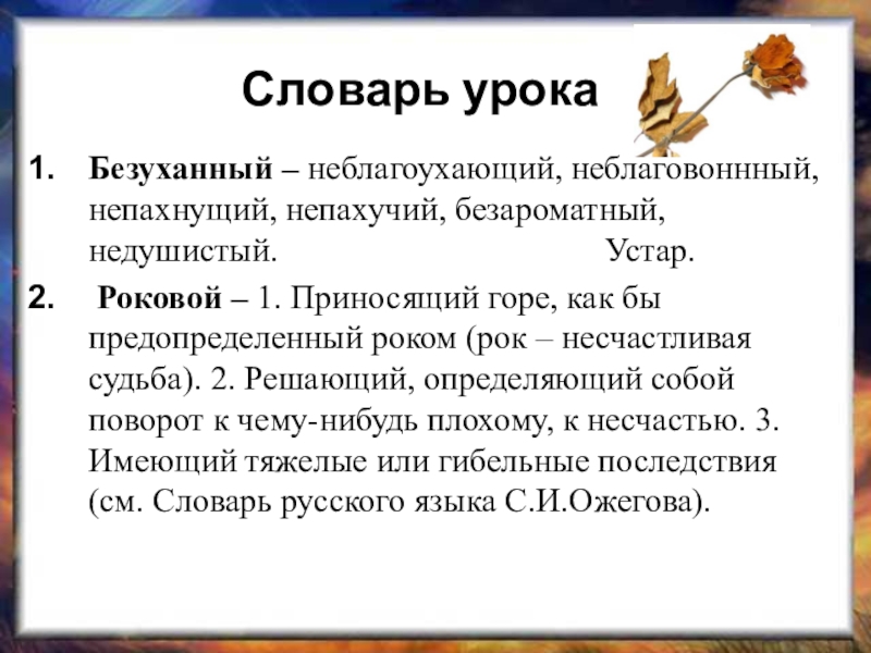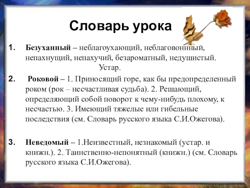 Словарь урокаБезуханный – неблагоухающий, неблаговоннный, непахнущий, непахучий, безароматный, недушистый. 								Устар. Роковой – 1. Приносящий горе, как бы