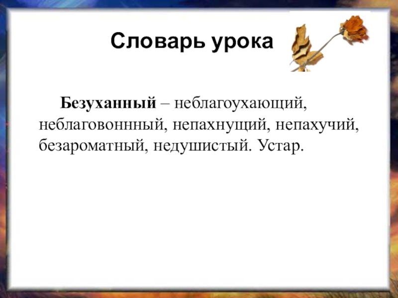 Словарь урока	     Безуханный – неблагоухающий, неблаговоннный, непахнущий, непахучий, безароматный, недушистый. Устар.