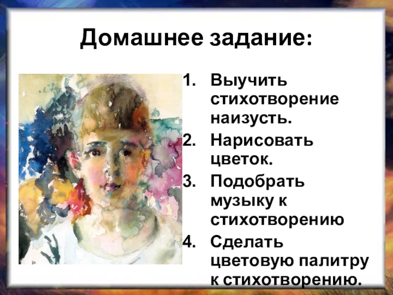 Домашнее задание:Выучить стихотворение наизусть.Нарисовать цветок.Подобрать музыку к стихотворениюСделать цветовую палитру к стихотворению.