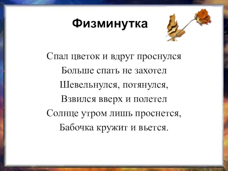 ФизминуткаСпал цветок и вдруг проснулсяБольше спать не захотелШевельнулся, потянулся,Взвился вверх и полетелСолнце утром лишь проснется, Бабочка кружит