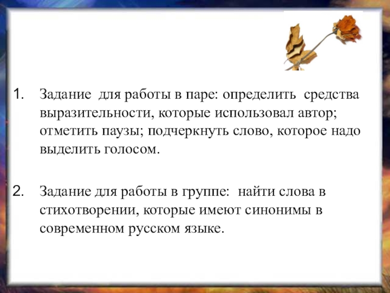 Задание для работы в паре: определить средства выразительности, которые использовал автор; отметить паузы; подчеркнуть слово, которое надо