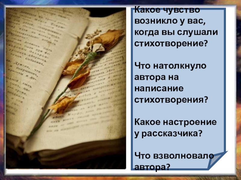 Какое чувство возникло у вас, когда вы слушали стихотворение?Что натолкнуло автора на написание стихотворения?Какое настроение у рассказчика?Что