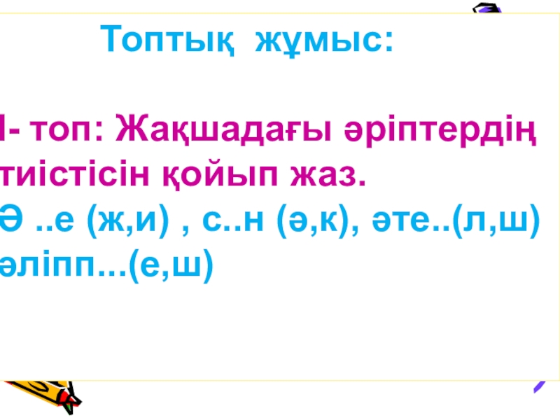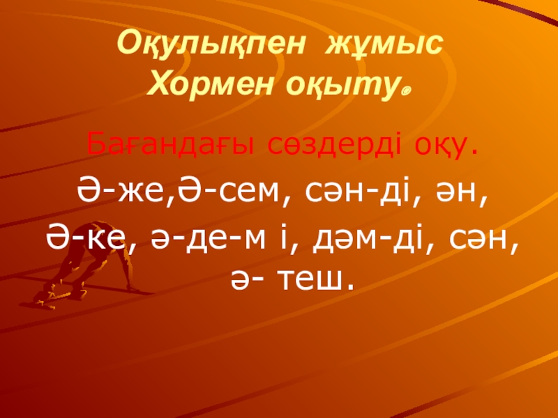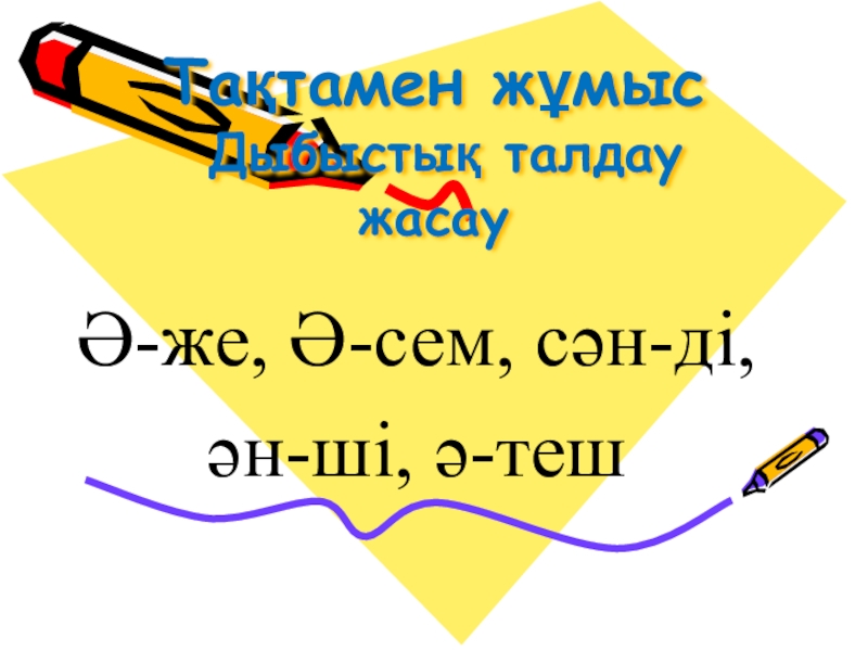 Сөзге дыбыстық талдау жасау.Ә әрпі бар сөздерді оқи білуге ,буынға бөліп оқуға жаттықтыру.Сурет бойынша сөйлем құрату.Жазылу ерекшеліктеріне мән беру.
