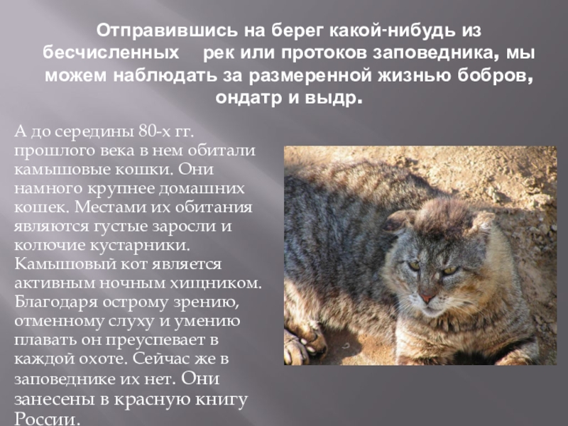 А до середины 80-х гг. прошлого века в нем обитали камышовые кошки. Они намного крупнее домашних кошек. Местами их обитания являются густые заросли и колючие кустарники. Камышовый кот является активным ночным хищником. Благодаря острому зрению, отменному слуху и умению плавать он преуспевает в каждой охоте. Сейчас же в заповеднике их нет. Они занесены в красную книгу России.