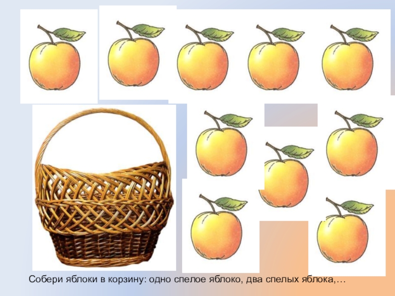 Слайд 28Собери яблоки в корзину: одно спелое яблоко, два спелых яблока,…