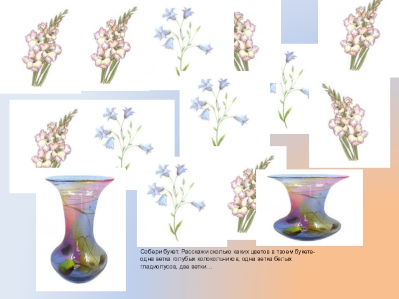 Собери букет. Расскажи сколько каких цветов в твоем букете- одна ветка голубых колокольчиков, одна ветка белых гладиолусов,
