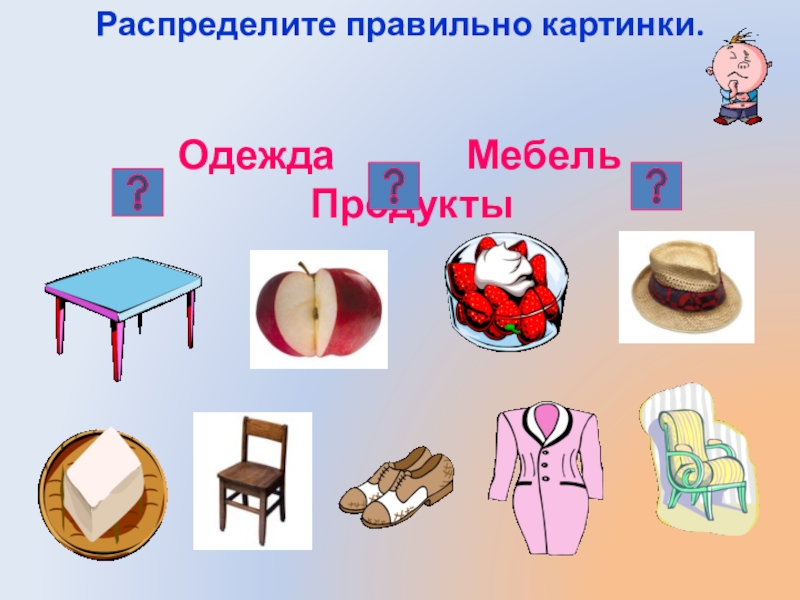 Распределите правильно картинки.Одежда       Мебель     Продукты