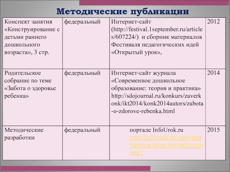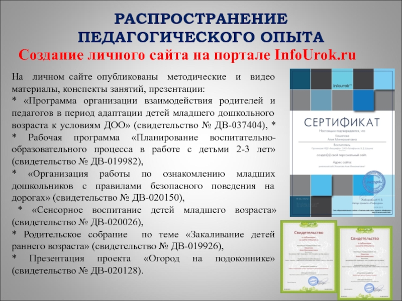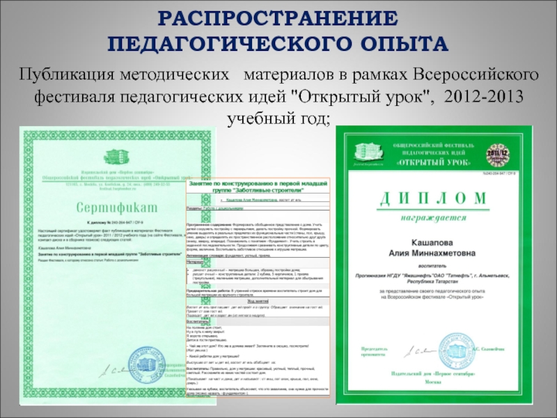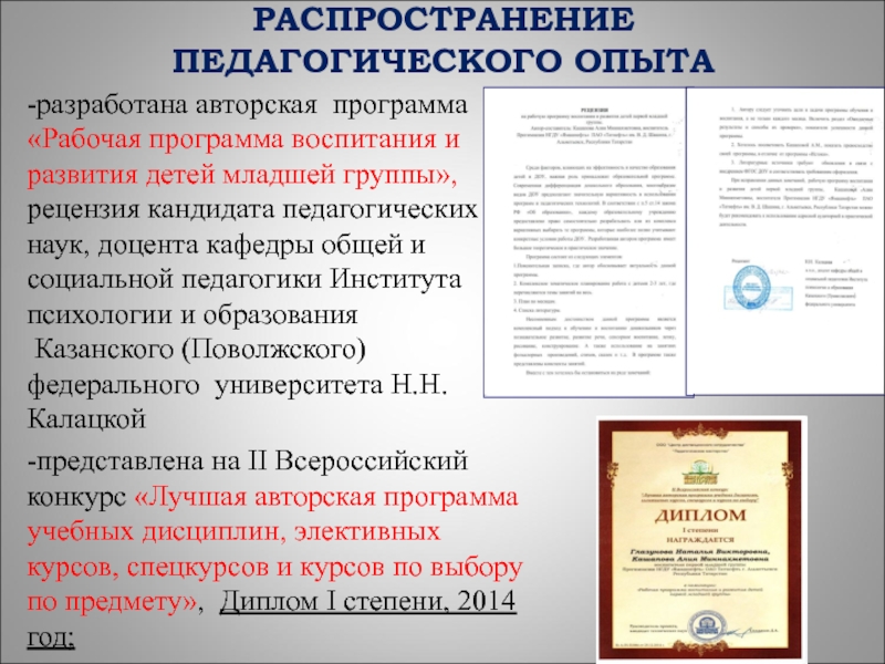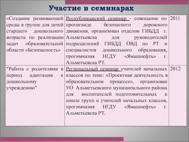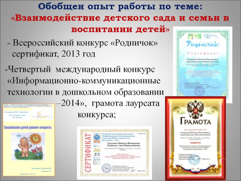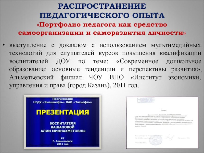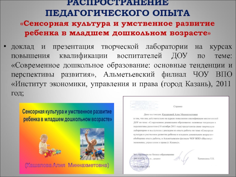 доклад и презентация творческой лаборатории на курсах повышения квалификации воспитателей ДОУ по теме: «Современное дошкольное образование: основные тенденции и перспективы развития», Альметьевский филиал ЧОУ ВПО «Институт экономики, управления и права (город Казань), 2011 год;