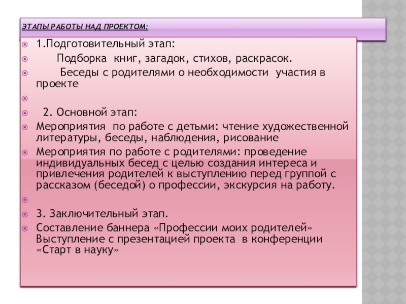 Задачи: расширять у детей представления о разнообразии профессий на основе характерных трудовых процессов и результатов труда, представлении о структуре труда (цель, мотив, материал, трудовые действия, результат); привлечь родителей воспитанников к участию в проекте.
