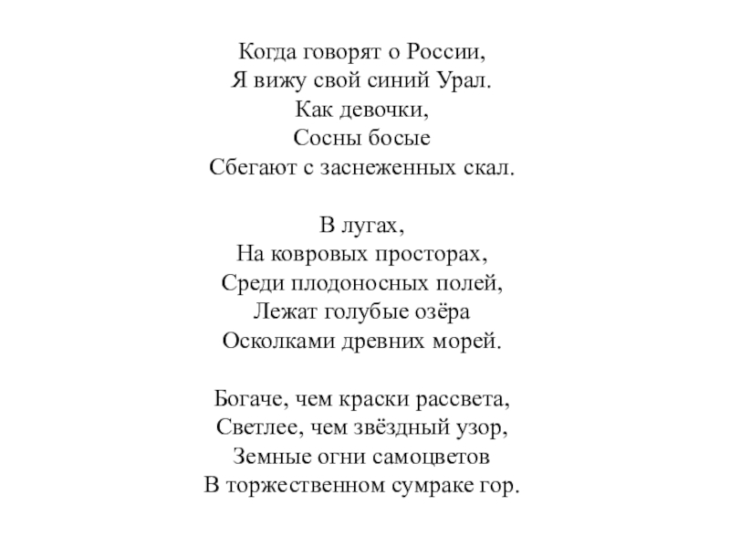 Когда говорят о России, Я вижу свой синий Урал. Как девочки,  Сосны босые Сбегают с заснеженных скал. В лугах,  На ковровых просторах, Среди плодоносных полей, Лежат голубые озёра Осколками древних морей. Богаче, чем краски