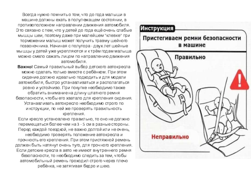 должны ехать в полулежащем состоянии, в противоположном направлении движения автомобиля. Это связано с тем, что у детей до года ещё очень слабые мышцы шеи, поэтому даже при малейшем "клевке" при торможении малыш может получить травму шейного позвоночника. Начиная с полутора - двух лет шейные мышцы у детей уже укрепляются и к трём годам малыша можно смело сажать лицом по направлению движения автомобиля.