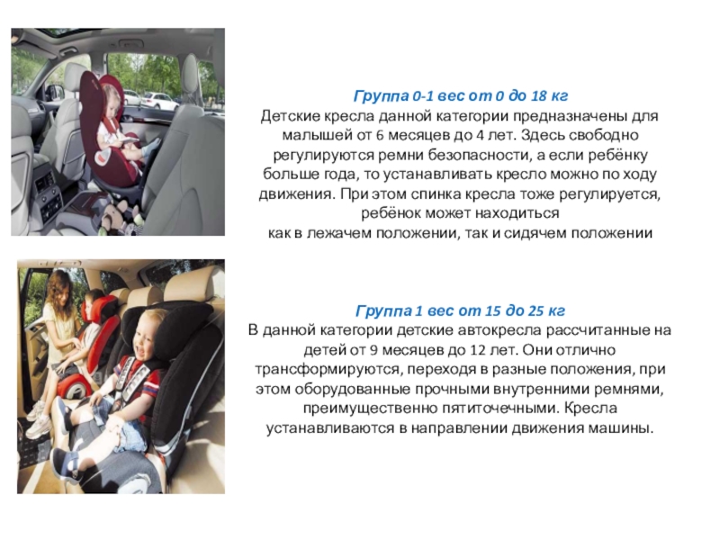 предназначены для малышей от 6 месяцев до 4 лет. Здесь свободно регулируются ремни безопасности, а если ребёнку больше года, то устанавливать кресло можно по ходу движения. При этом спинка кресла тоже регулируется, ребёнок может находиться