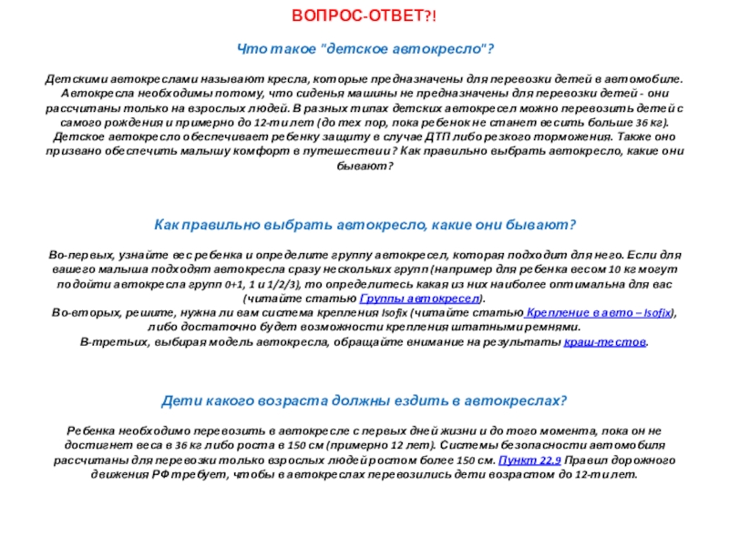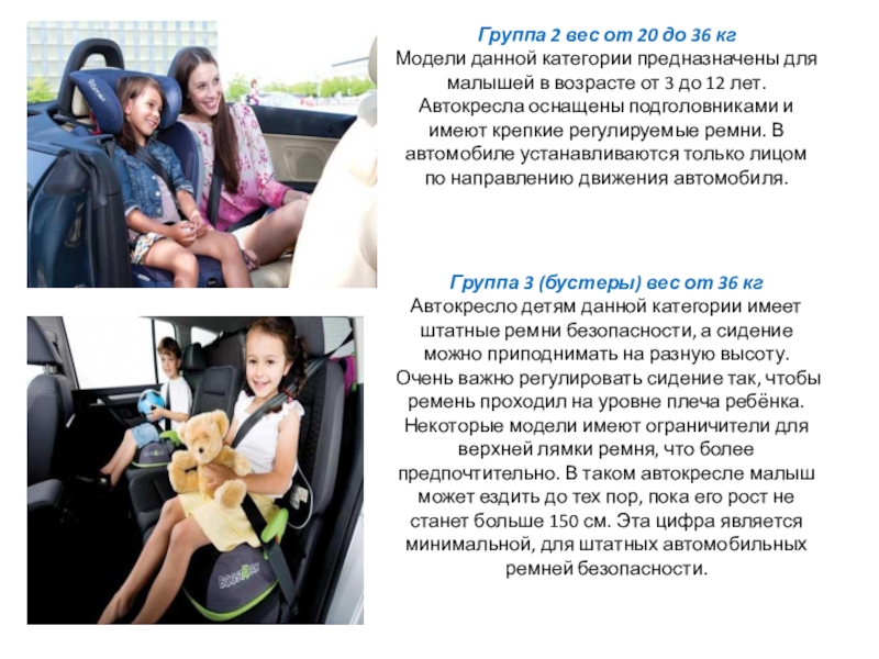детей в автомобиле. Автокресла необходимы потому, что сиденья машины не предназначены для перевозки детей - они рассчитаны только на взрослых людей. В разных типах детских автокресел можно перевозить детей с самого рождения и примерно до 12-ти лет (до тех пор, пока ребенок не станет весить больше 36 кг). Детское автокресло обеспечивает ребенку защиту в случае ДТП либо резкого торможения. Также оно призвано обеспечить малышу комфорт в путешествии ? Как правильно выбрать автокресло, какие они бывают?
