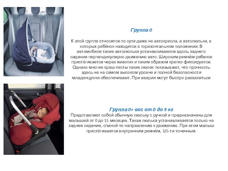 автолюльки, в которых ребёнок находится в горизонтальном положении. В автомобиле такие автолюльки устанавливаются вдоль заднего сидения перпендикулярно движению авто. Широким ремнём ребенок пристёгивается через животик и таким образом крепко фиксируется. Однако многие краш-тесты таких люлек показывают, что прочность здесь не на самом высоком уровне и полной безопасности младенцуоне обеспечивают. При аварии могут быстро развалиться