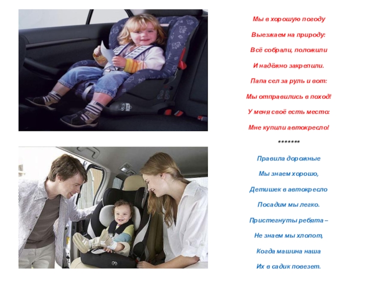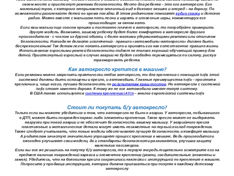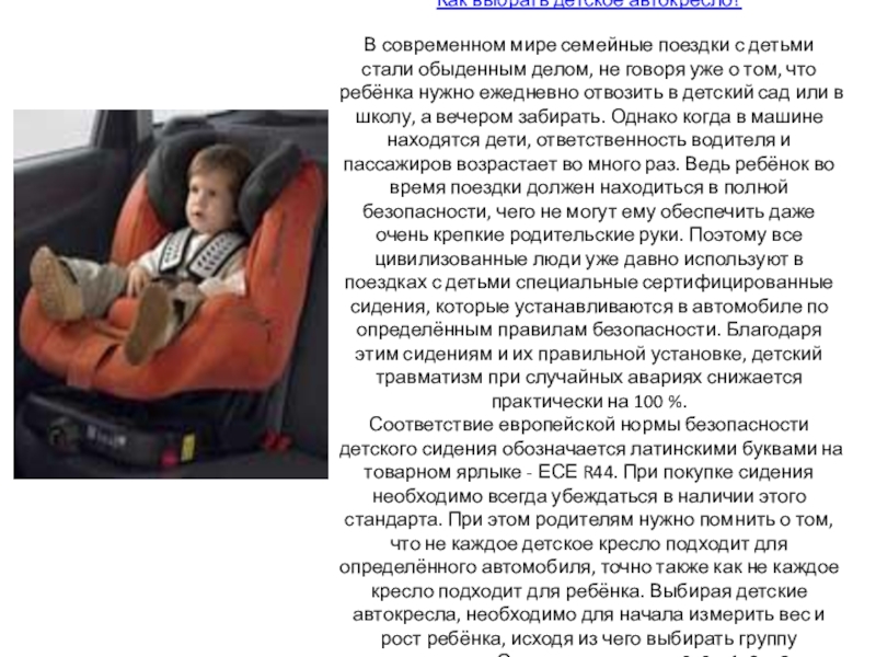 обыденным делом, не говоря уже о том, что ребёнка нужно ежедневно отвозить в детский сад или в школу, а вечером забирать. Однако когда в машине находятся дети, ответственность водителя и пассажиров возрастает во много раз. Ведь ребёнок во время поездки должен находиться в полной безопасности, чего не могут ему обеспечить даже очень крепкие родительские руки. Поэтому все цивилизованные люди уже давно используют в поездках с детьми специальные сертифицированные сидения, которые устанавливаются в автомобиле по определённым правилам безопасности. Благодаря этим сидениям и их правильной установке, детский травматизм при случайных авариях снижается практически на 100 %.