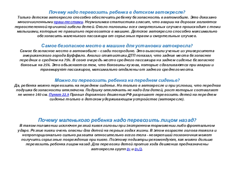 ребенку безопасность в автомобиле. Это доказано многочисленными краш-тестами. Неумолимая статистика гласит, что аварии на дорогах являются первостепенной причиной гибели детей. Около половины всех смертельных случаев происходит с теми малышами, которые не правильно перевозятся в машине. Детское автокресло способно максимально обезопасить маленького пассажира от серьезных травм и смертельных случаев.