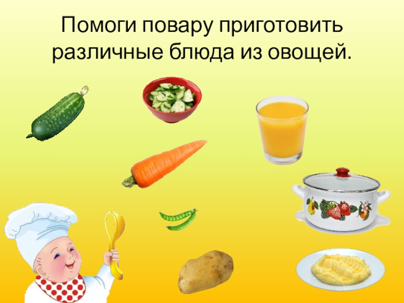 Слайд 8Помоги повару приготовить различные блюда из овощей.