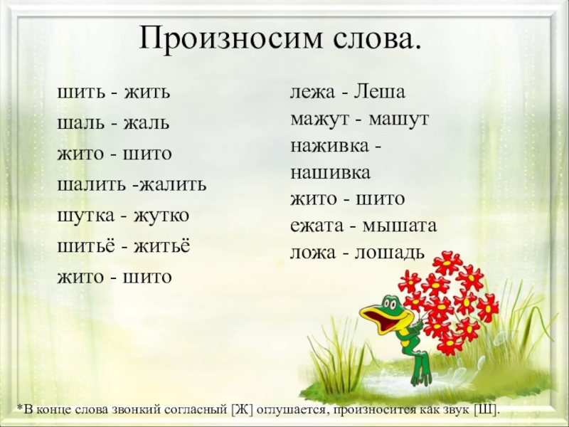 *В конце слова звонкий согласный [Ж] оглушается, произносится как звук [Ш].