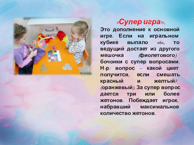 выпало «6», то ведущий достает из другого мешочка (фиолетового) бочонки с супер вопросами. Н-р: вопрос – какой цвет получится, если смешать красный и желтый? (оранжевый). За супер вопрос дается три или более жетонов. Побеждает игрок, набравший максимальное количество жетонов.