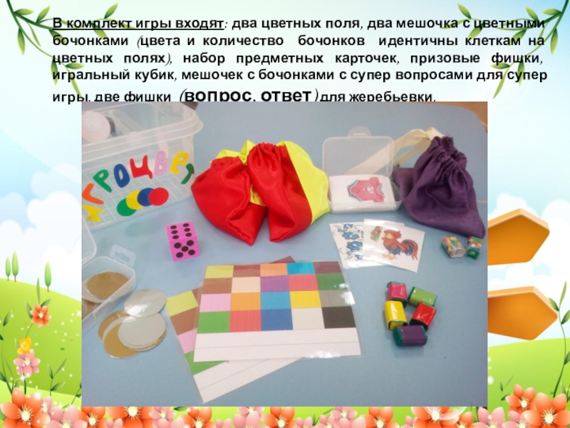 Слайд 3В комплект игры входят: два цветных поля, два мешочка с цветными