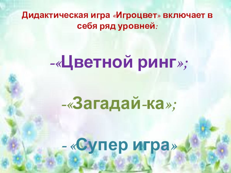 Слайд 4Дидактическая игра «Игроцвет» включает в себя ряд уровней: