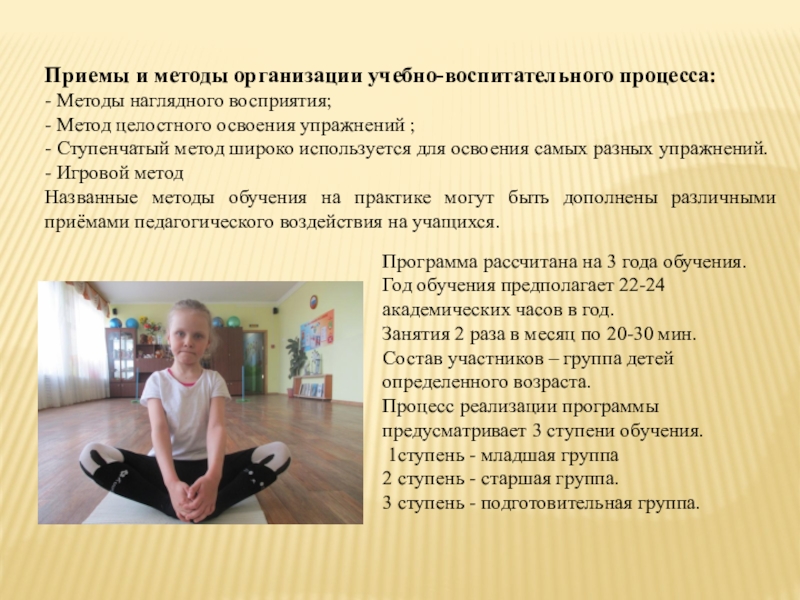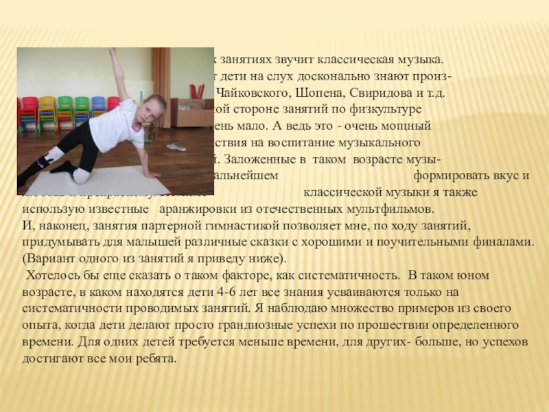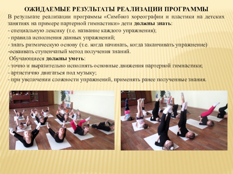 В данной программе представлен особый, более широкий комплексный подход к реализации цели и задач обучения детей, увеличен раздел хореографической подготовки. Гимнастика на основе хореографии является более интересной для детей любого возраста, легче осваивается ими и приводит