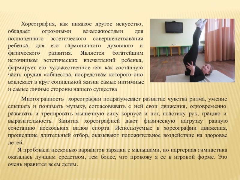Хореография, как никакое другое искусство, обладает огромными возможностями для полноценного эстетического совершенствования ребенка, для его гармоничного духовного и физического развития. Является богатейшим источником эстетических впечатлений ребенка, формирует его художественное «я» как составную часть орудия «общества, посредствам которого оно вовлекает в круг социальной жизни самые интимные и самые личные стороны нашего существа
