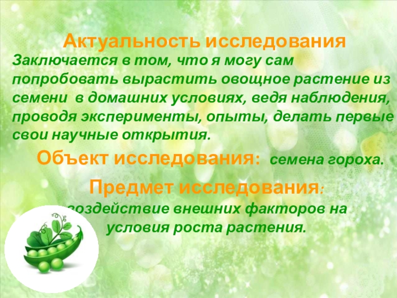 Заключается в том, что я могу сам попробовать вырастить овощное растение из семени в домашних условиях, ведя наблюдения, проводя эксперименты, опыты, делать первые свои научные открытия.