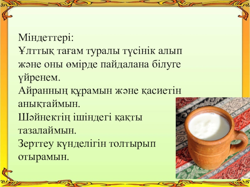 Слайд 3Міндеттері:  Ұлттық тағам туралы түсінік алып және оны өмірде пайдалана білуге үйренем.  Айранның