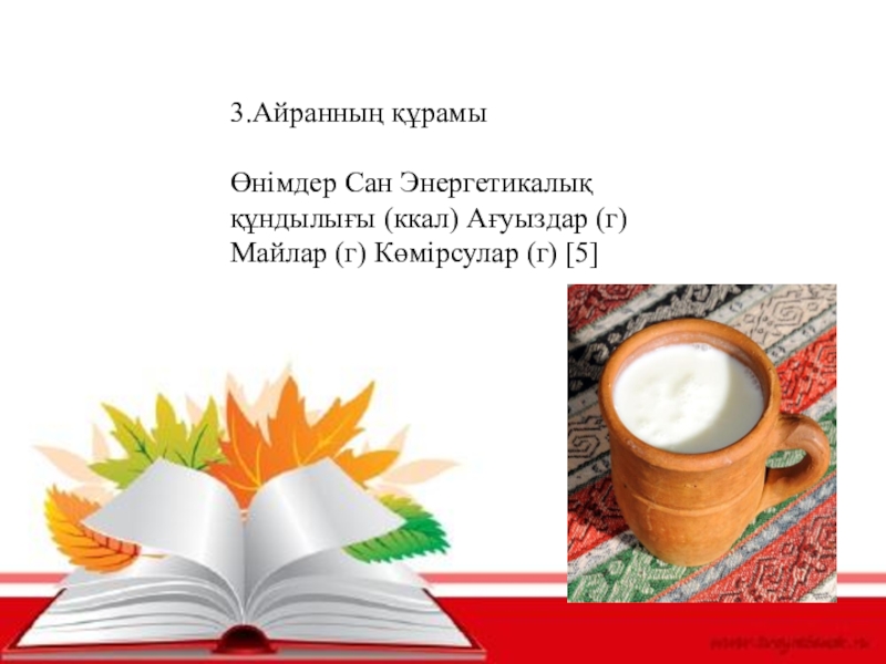 3.Айранның құрамы   Өнімдер Сан Энергетикалық құндылығы (ккал) Ағуыздар (г) Майлар (г) Көмірсулар (г) [5]
