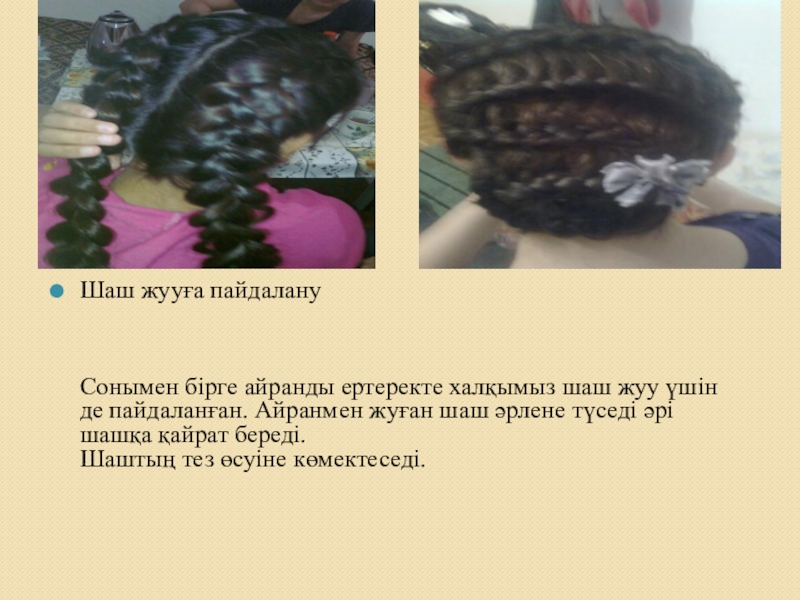 Слайд 8Шаш жууға пайдалану  Сонымен бірге айранды ертеректе халқымыз шаш жуу үшін де
