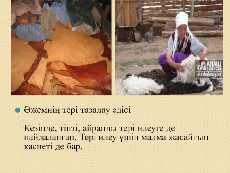 Слайд 11  Әжемнің жануарлардың терісін ащы айранмен тазалау әдісін бақылап, өзім бір