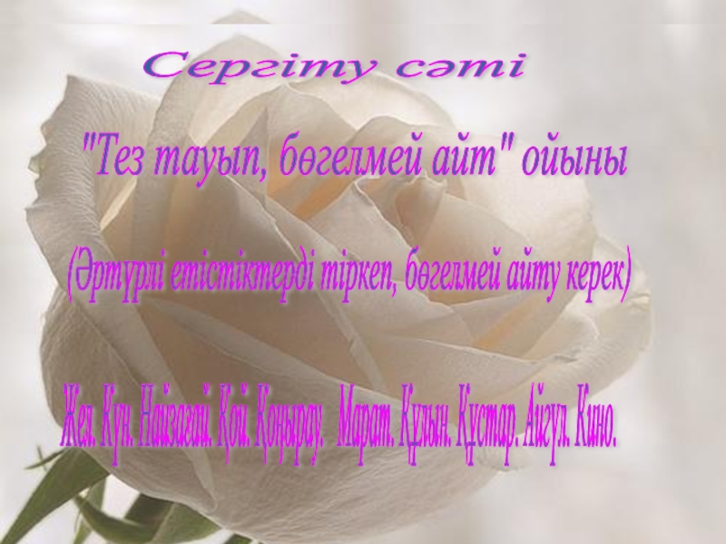 Жел. Күн. Найзағай. Қой. Қоңырау. Марат. Құлын. Құстар. Айгүл. Кино.