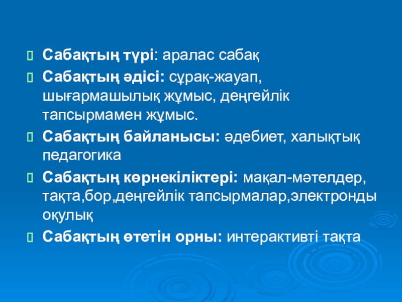 Сабақтың көрнекіліктері: мақал-мәтелдер, тақта,бор,деңгейлік тапсырмалар,электронды оқулық