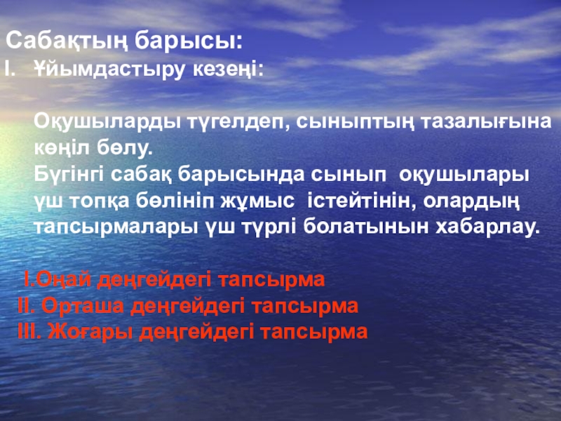 барысында сынып оқушылары үш топқа бөлініп жұмыс істейтінін, олардың тапсырмалары үш түрлі болатынын хабарлау.