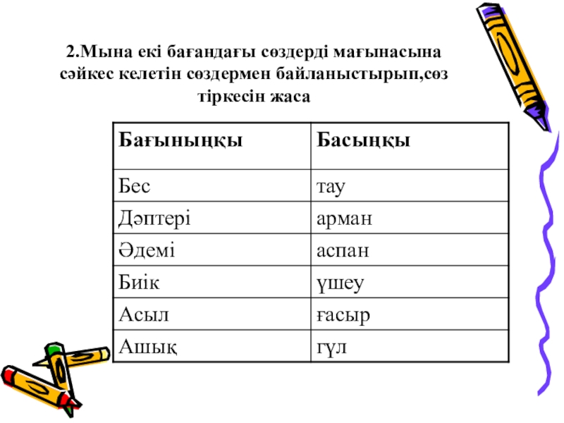 Слайд 122.Мына екі бағандағы сөздерді мағынасына сәйкес келетін сөздермен байланыстырып,сөз тіркесін жаса