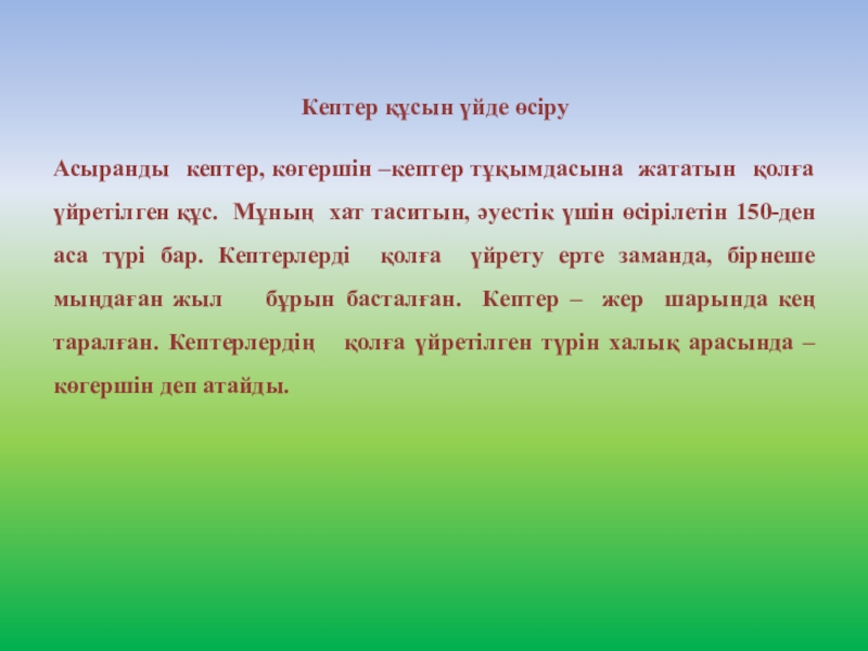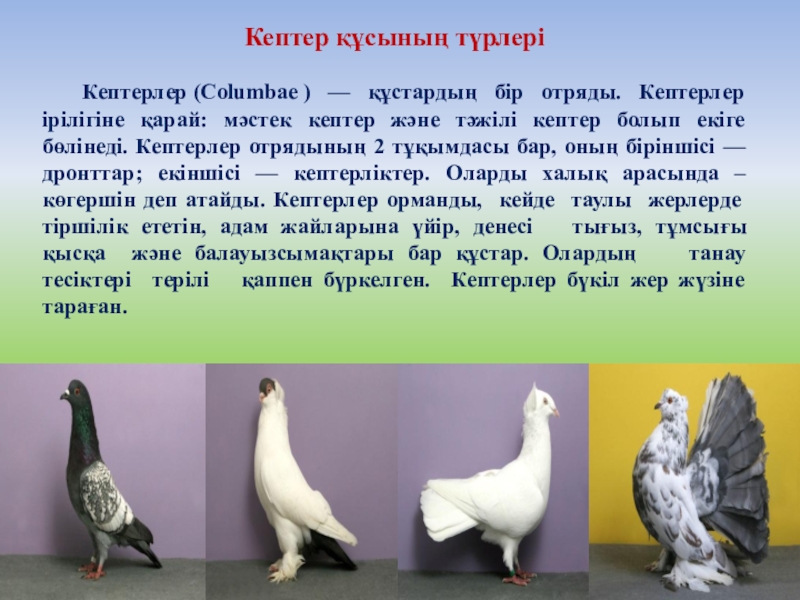 Слайд 2Мақсаты: Жалпы құстар туралы және кептер құсының түрлері мен оны қолда