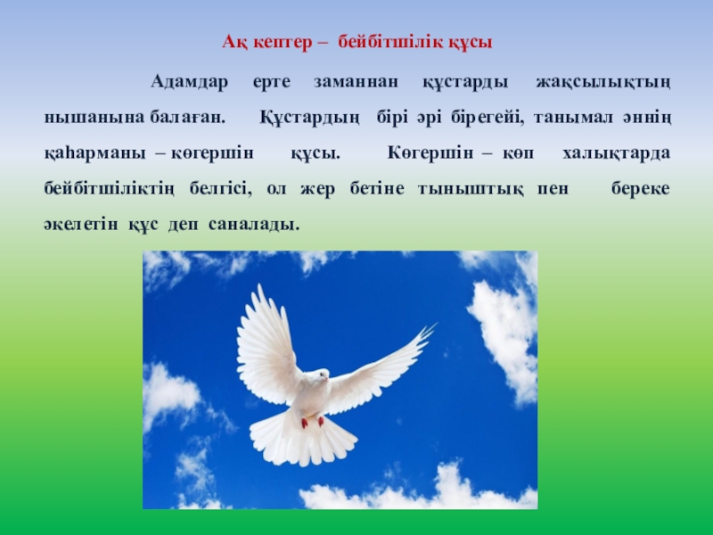Слайд 5Ақ кептер – бейбітшілік құсы