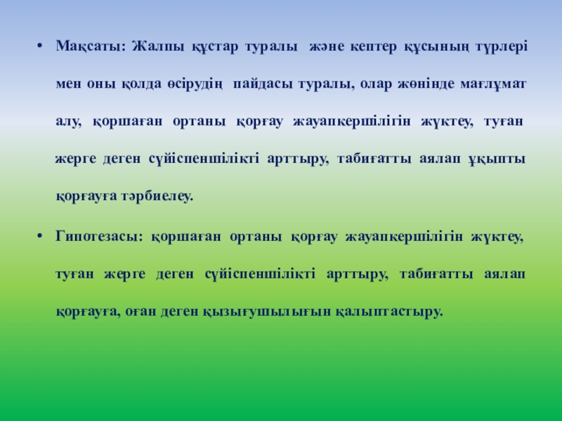 Гипотезасы: қоршаған ортаны қорғау жауапкершілігін жүктеу, туған жерге деген сүйіспеншілікті арттыру, табиғатты аялап қорғауға, оған деген қызығушылығын қалыптастыру.