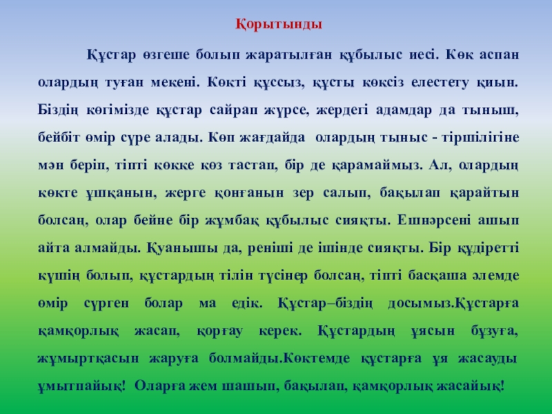 аспан олардың туған мекені. Көкті құссыз, құсты көксіз елестету қиын. Біздің көгімізде құстар сайрап жүрсе, жердегі адамдар да тыныш, бейбіт өмір сүре алады. Көп жағдайда олардың тыныс - тіршілігіне мән беріп, тіпті көкке көз тастап, бір де қарамаймыз. Ал, олардың көкте ұшқанын, жерге қонғанын зер салып, бақылап қарайтын болсаң, олар бейне бір жұмбақ құбылыс сияқты. Ешнәрсені ашып айта алмайды. Қуанышы да, реніші де ішінде сияқты. Бір құдіретті күшің болып, құстардың тілін түсінер болсаң, тіпті басқаша әлемде өмір сүрген болар ма едік. Құстар–біздің досымыз.Құстарға қамқорлық жасап, қорғау керек. Құстардың ұясын бұзуға, жұмыртқасын жаруға болмайды.Көктемде құстарға ұя жасауды ұмытпайық! Оларға жем шашып, бақылап, қамқорлық жасайық!