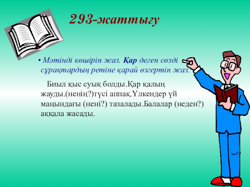 Қарамен жазылған сөздерді теріп жаз.Жұрнақ пен жалғауды тиісті белгілермен белгіле.