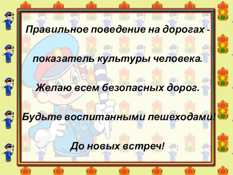 Правильное поведение на дорогах -  показатель культуры человека. Желаю всем безопасных дорог. Будьте воспитанными пешеходами!До новых встреч!